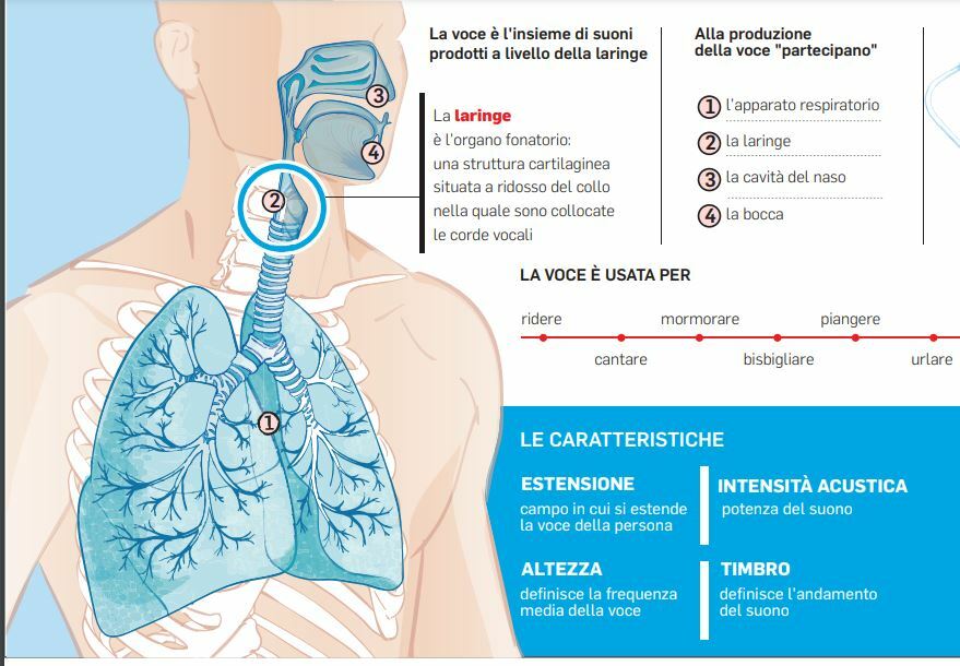 Parlare è un’attività che sembra del tutto normale e naturale. Ma la produzione della voce è in realtà un complesso processo che richiede una serie di movimenti coordinati da parte dei muscoli coinvolti nella respirazione, nella fonazione, nell’articolazione dei suoni (muscoli della gola, del palato, della lingua e delle labbra). Movimenti controllati dal cervello e monitorati dal nostro udito. La potenza della voce deriva dai polmoni: durante l’espirazione, lasciando i polmoni appunto, l’aria crea una corrente che attraversa la trachea e raggiunge la laringe. La magia della voce nasce proprio nella laringe (che gli inglesi chiamano la “scatola della voce”) che ospita le corde vocali, due pliche di muscolo e cartilagine, rivestite di mucosa, tese in orizzontale, che si aprono come due porte scorrevoli durante la respirazione e si accostano quando inghiottiamo il cibo (per evitare che vada di traverso) e durante la produzione della voce. Queste due soffici pliche, attraversate dall’aria, producono vibrazioni armoniche a frequenza diversa, da 100 a 1000 volte al secondo, a seconda del suono prodotto (acuto o grave). Il tono della voce è determinato dalla lunghezza e dalla tensione delle corde vocali, controllata a sua volta dai muscoli laringei. Ma il lavoro delle corde vocali, per quanto prezioso, non basta; il suono generato a questo livello assomiglierebbe infatti ad una specie di ronzio se non intervenissero i muscoli dell’orofaringe, della lingua e delle labbra per articolarlo e diverse “casse di risonanza” (faringe, naso, seni paranasali) per amplificarlo. È così che si completa l’opera e la voce assume la caratteristica identità umana, che trova la sua più alta declinazione nel canto lirico. I disturbi della voce sono tanti e vengono trattati dagli otorinolaringoiatri, coadiuvati dai logopedisti. Quando le corde vocali si infiammano o diventano sede di crescita di tessuti anomali o si paralizzano, non riescono più a lavorare e compare un disturbo della voce.