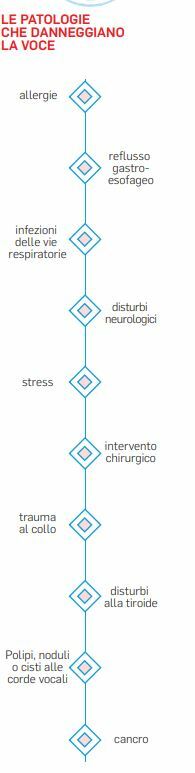 Il più comune in assoluto è la laringite, seguito dalla comparsa di polipi e noduli delle corde vocali (escrescenze benigne causate da traumi o uso eccessivo della voce), da lesioni precancerose o cancerose. Tra i disturbi neurologici che possono colpire questa zona ci sono la paralisi delle corde vocali e la disfonia spasmodica (dovuta a spasmi involontari dei muscoli laringei, causati forse da un disturbo del sistema nervoso centrale).