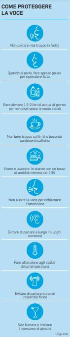 Parlare è un’attività che sembra del tutto normale e naturale. Ma la produzione della voce è in realtà un complesso processo che richiede una serie di movimenti coordinati da parte dei muscoli coinvolti nella respirazione, nella fonazione, nell’articolazione dei suoni (muscoli della gola, del palato, della lingua e delle labbra). Movimenti controllati dal cervello e monitorati dal nostro udito. La potenza della voce deriva dai polmoni: durante l’espirazione, lasciando i polmoni appunto, l’aria crea una corrente che attraversa la trachea e raggiunge la laringe. La magia della voce nasce proprio nella laringe (che gli inglesi chiamano la “scatola della voce”) che ospita le corde vocali, due pliche di muscolo e cartilagine, rivestite di mucosa, tese in orizzontale, che si aprono come due porte scorrevoli durante la respirazione e si accostano quando inghiottiamo il cibo (per evitare che vada di traverso) e durante la produzione della voce. Queste due soffici pliche, attraversate dall’aria, producono vibrazioni armoniche a frequenza diversa, da 100 a 1000 volte al secondo, a seconda del suono prodotto (acuto o grave). Il tono della voce è determinato dalla lunghezza e dalla tensione delle corde vocali, controllata a sua volta dai muscoli laringei. Ma il lavoro delle corde vocali, per quanto prezioso, non basta; il suono generato a questo livello assomiglierebbe infatti ad una specie di ronzio se non intervenissero i muscoli dell’orofaringe, della lingua e delle labbra per articolarlo e diverse “casse di risonanza” (faringe, naso, seni paranasali) per amplificarlo. È così che si completa l’opera e la voce assume la caratteristica identità umana, che trova la sua più alta declinazione nel canto lirico. I disturbi della voce sono tanti e vengono trattati dagli otorinolaringoiatri, coadiuvati dai logopedisti. Quando le corde vocali si infiammano o diventano sede di crescita di tessuti anomali o si paralizzano, non riescono più a lavorare e compare un disturbo della voce.