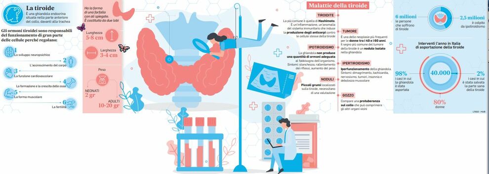 ll grande Leonardo pensava che l’unica funzione della tiroide fosse quella di “riempire un vuoto nel collo”, subito sotto il pomo d’Adamo. In realtà con i suoi 20 grammi di peso, questa ghiandola endocrina è in grado di influenzare ogni singola cellula dell’organismo. Attraverso i suoi ormoni (tiroxina o T4 e triiodotironina o T3) la tiroide agisce infatti da interruttore generale del metabolismo, inteso come quell’insieme di processi che trasformano il cibo che mangiamo in energia, con la quale “alimentare” tutto il corpo per mantenere il normale funzionamento degli organi. Per questo, in caso di aumentata produzione di ormoni (ipertiroidismo) o di un loro deficit (ipotiroidismo), compaiono una serie di sintomi e di problemi. Le principali patologie della tiroide sono la tiroidite di Hashimoto, l’ipertiroidismo, il gozzo e i noduli.